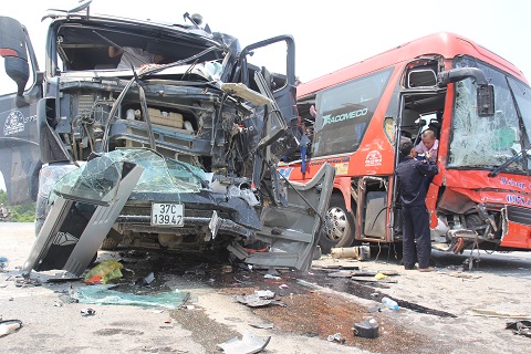 Cú đâm khiến cả hai xe lao vào lề đường, đầu xe nát bét và biến dạng, 2 người trên xe tải và 4 người trên khách bị thương phải nhập viện cấp cứu, trong đó có một phụ xe khách.