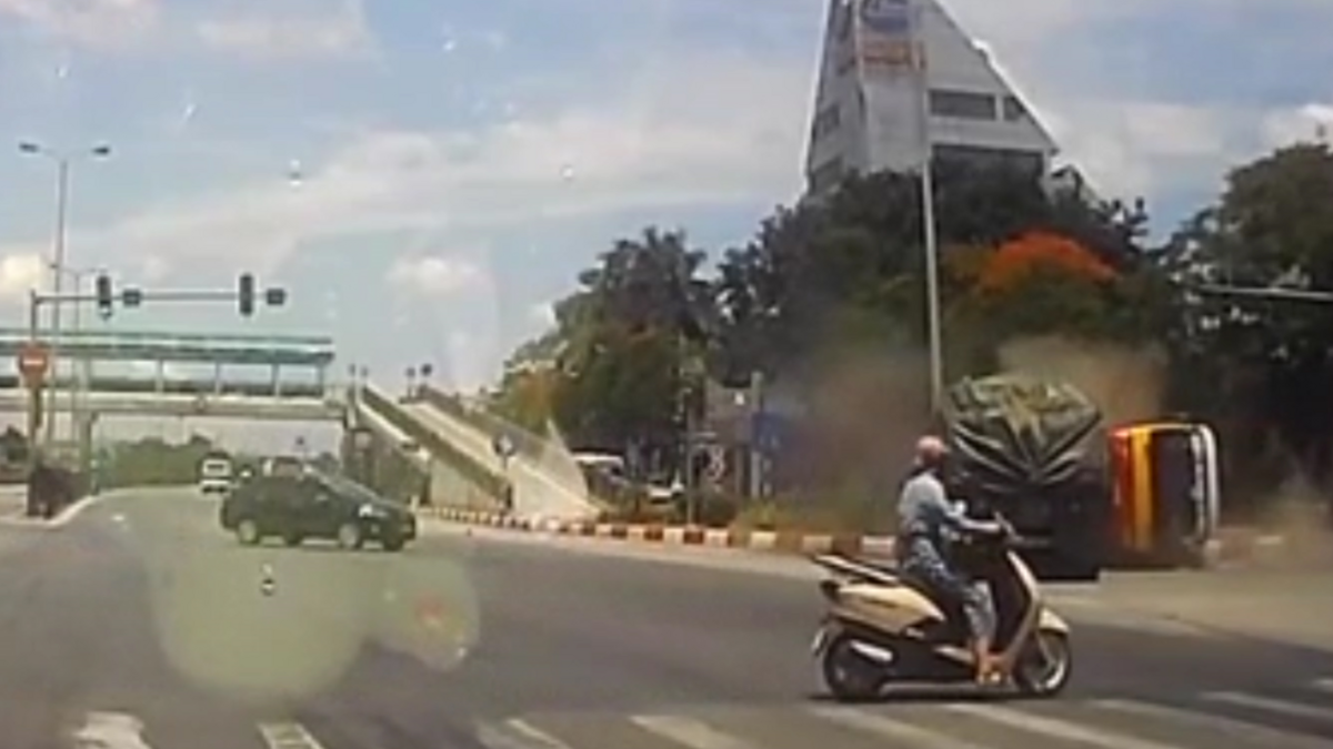 Clip ghi lại hình ảnh chiếc xe tải cố tình vượt đèn đỏ, sau đó đâm vào xe buýt đang rẽ ngang khiến xe buýt bị lật tại ngã tư 559, Hải Dương.