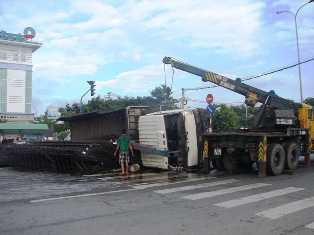 Cú tông mạnh khiến chiếc xe tải chở sắt chao đảo rồi lật ngang đường, hàng chục tấn sắt rơi xuống vung vãi khắp nơi. Chiếc xe còn lại phần đầu bị biến dạng hư hỏng nặng. Tài xế và phụ xe tải 54Z-4346 bị thương nặng được đưa đi cấp cứu. Vụ việc xảy ra lúc cao điểm khiến giao thông khu vực bị ùn tắc nghiêm trọng.