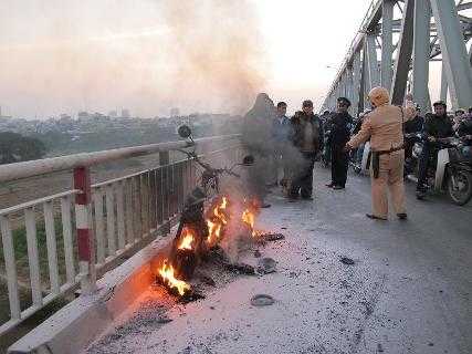 (VTC News) - Chiều nay, một vụ cháy xe máy nữa lại xảy ra giữa Hà Nội. Chiếc xe máy đã bốc cháy trên cầu Chương Dương làm giao thông qua đây bị tắc nghẽn nghiêm trọng.