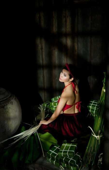 Trong hình ảnh cô gái xứ Bắc nấu bánh chưng hay cô gái miền Nam nấu bánh tét, á hậu Hoàng My đều rất khéo léo và chuyên nghiệp.