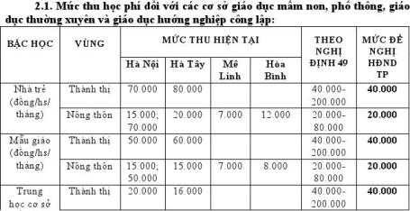 Ngày 11/7, HĐND Hà Nội thông qua Nghị quyết miễn, giảm học phí, hỗ trợ chi phí học tập mới. Theo đó, kể từ năm học 2012-2013, Hà Nội áp dụng mức học phí ở các bậc học là 40.000 đồng/tháng với khu vực thành thị, 20.000 đồng/tháng với khu vực nông thôn.
