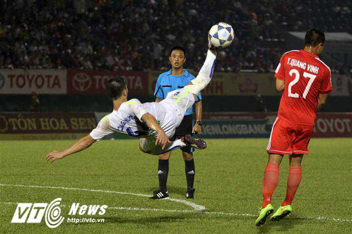 Hoàn toàn trái ngược với đàn em, tiền đạo Lê Công Vinh tiếp tục thể hiện phong độ cao.(Ảnh: Hoàng Tùng)