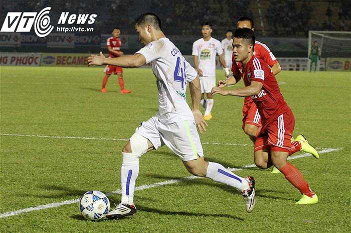 Ngoài Công Phượng, những mũi nhọn tấn công khác của HAGL là Minh Vương, Thanh Tùng, dù rất cố gắng nhưng không thể khoan thủng hàng thủ B.Binh Dương.(Ảnh: Hoàng Tùng)