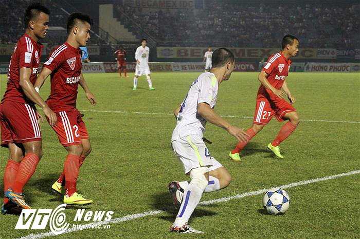 Công Vinh cùng các mũi nhọn khác luôn khiến khung thành thủ môn Minh Nhựt đặt trong tình trạng báo động. (Ảnh: Hoàng Tùng)