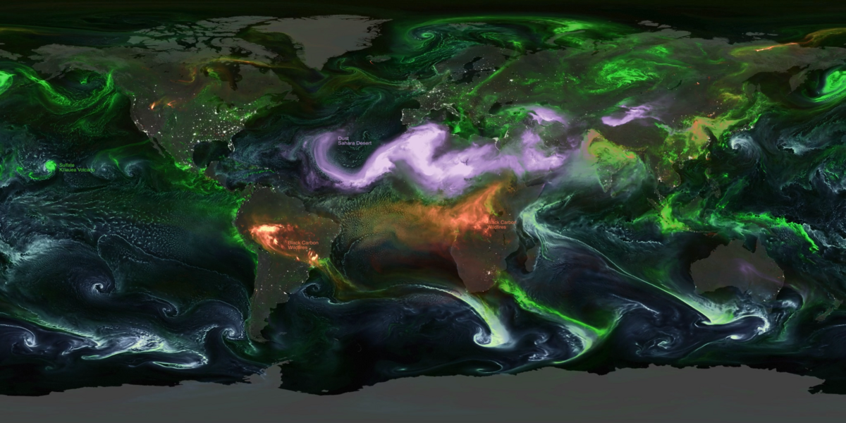 Hình ảnh do NASA’s Global Modeling and Assimilation Office kết hợp với Scientific Visualization Studio tạo ra cho thấy các luồng aerosol hình thành theo vùng, tạo thành những “dải mây” bay qua đại dương và lục địa, sự chuyển động của các hạt này phụ thuộc vào gió, độ cao và nguồn phát thải.