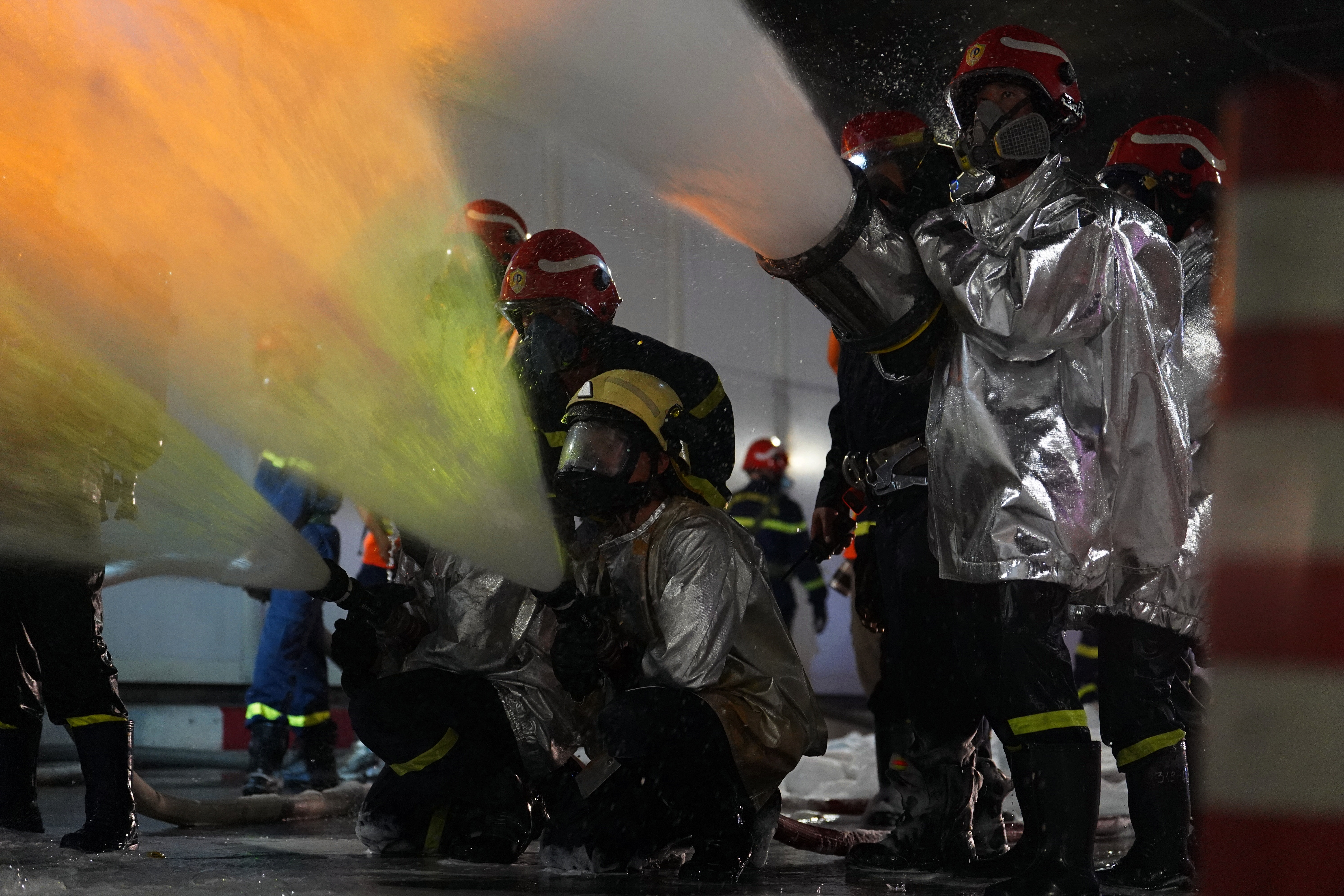 Ngay khi sự cố giả định xảy ra, lực lượng tại chỗ triển khai biện pháp chữa cháy ban đầu, vận hành hệ thống kỹ thuật hỗ trợ, sơ tán người bị nạn. Lực lượng PCCC chuyên nghiệp nhanh chóng có mặt với xe chữa cháy, cứu thương, cứu hộ để dập lửa, cứu người mắc kẹt, phân luồng giao thông.