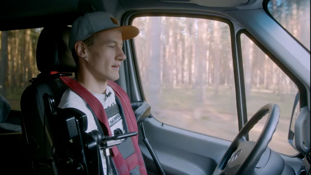 Với sự hỗ trợ của hệ thống điều khiển tùy chỉnh, chàng trai không tay chân Janis McDavid vẫn lái được chiếc Mercedes Sprinter đến nơi mình muốn.