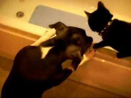 (VTC News) - Cả chó và mèo đều đang ở bên cạnh bồn nước ngó nghiêng nhưng bất ngờ chú mèo bị chó đẩy xuống nước.