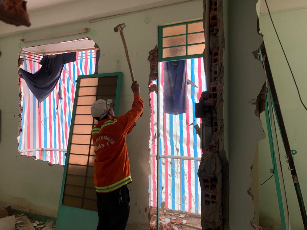Ông Hùng - đại diện Công ty TNHH MTV Dịch vụ Công ích Quận 1 (TP.HCM) cho biết: “Hiện đơn vị chúng tôi chỉ cho 10 công nhân tháo dỡ các phần sắt thép bên ngoài chung cư như lan can, hàng rào, cửa sổ, cửa kính, đập tường. Sau đó, đơn vị sẽ đưa máy móc liên quan vào hoàn thiện công việc tháo dỡ theo đúng quy trình xây dựng”.