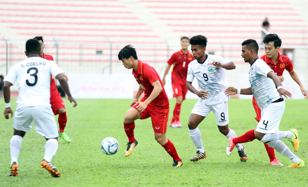 Công Phượng trong vòng vây của các cầu thủ U22 Đông Timor.