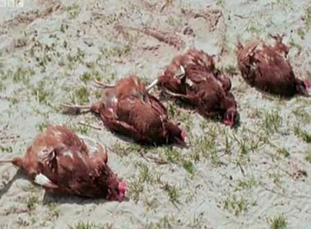 | Những chú gà bị "điểm huyệt" rơi vào trạng thái kỳ lạ. Ảnh từ clip |