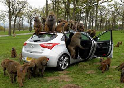 “Nạn nhân” là mẫu i30 Hatchback hoàn toàn mới. Chiếc xe mới tinh được mang tới công viên Knowsley Safari, Anh cho đàn khỉ đầu chó 40 con “nghịch” trong 10 tiếng đồng hồ.