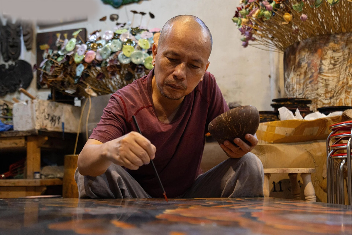 Sau đó, họ gắn, dán chất liệu cho tác phẩm như vỏ trứng, mảnh xà cừ, vàng, bạc, rồi lại phủ một lớp sơn lên bề mặt.