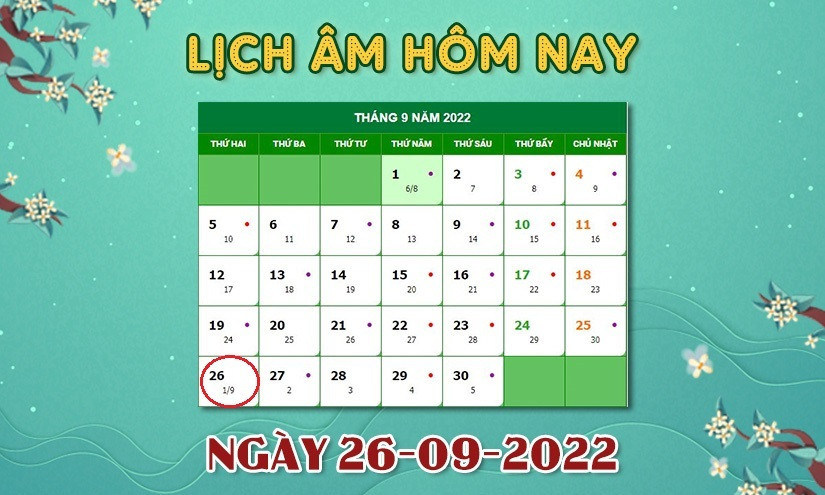 Dương lịch hôm nay là 26/9/2022, tương ứng với lịch âm là ngày 1/9.