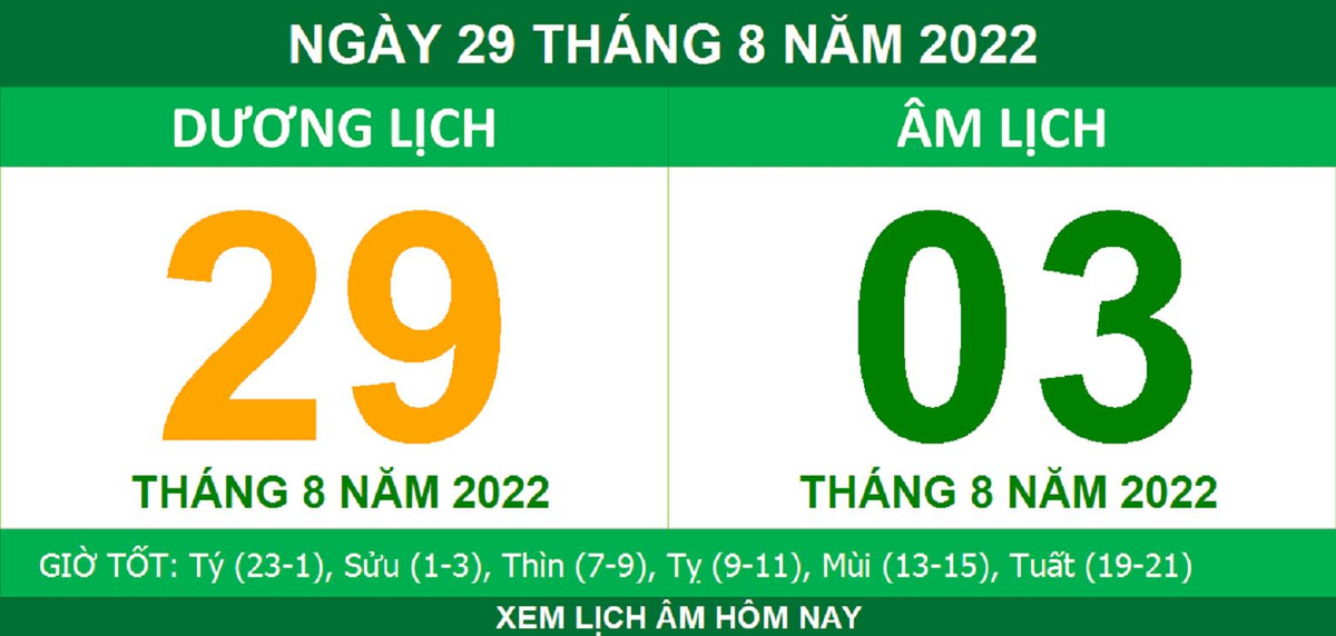 Dương lịch hôm nay là 29/8/2022, tương ứng với lịch âm là ngày 3/8.