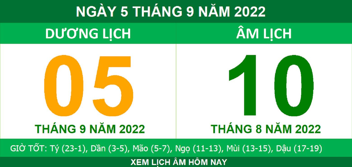 Dương lịch hôm nay là 5/9/2022, tương ứng với lịch âm là ngày 10/8.