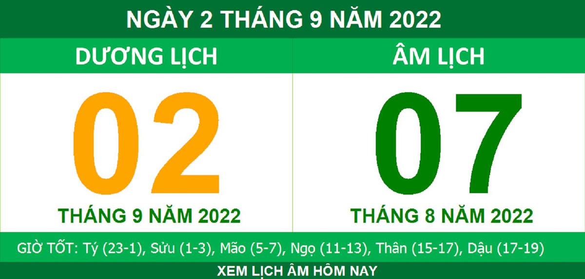 Dương lịch hôm nay là 2/9/2022, tương ứng với lịch âm là ngày 7/8.