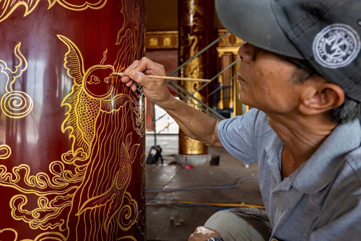 Một nghệ nhân đang tỉ mỉ khắc hoạ hình tượng linh vật rồng lên một trụ cột bên trong điện Thái Hoà. Tất cả các đường nét đều được nghệ nhân thực hiện một cách chỉn chu với độ chính xác tuyệt đối.