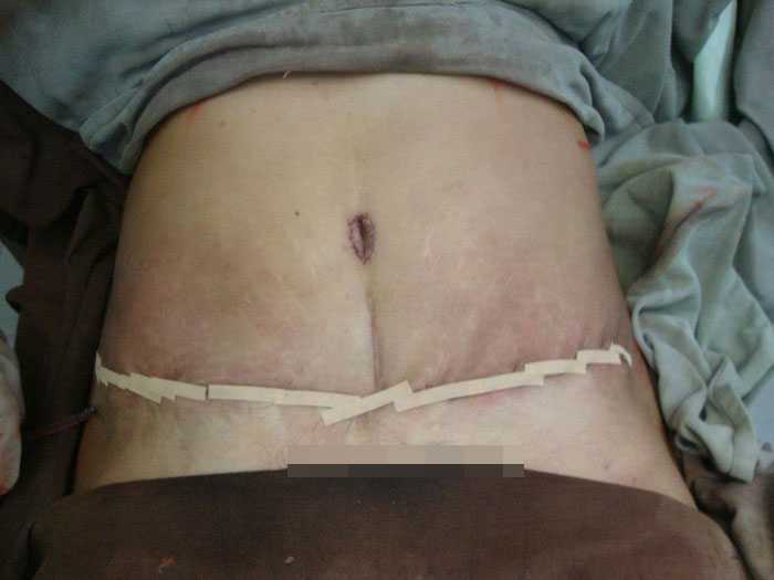 Vì bụng to, da bị giãn nên da bụng của người này được lột ra để loại bỏ bớt.