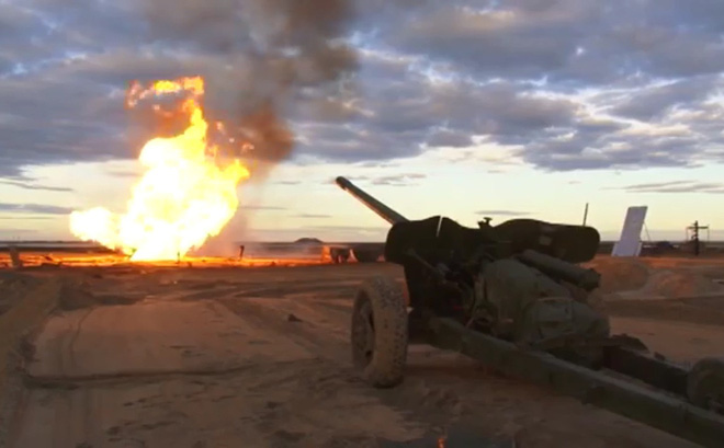 Hình ảnh từ video cho thấy, các binh sĩ triển khai khẩu pháo trong đêm. Nhiều phát đạn được nã liên tục để thổi bay giàn đầu giếng - thiết bị được lắp đặt trên miệng giếng dầu.