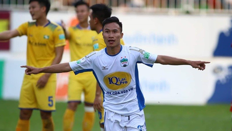 Triệu Việt Hưng ăn mừng bàn thắng vào lưới SLNA. (Ảnh: Minh Trần).