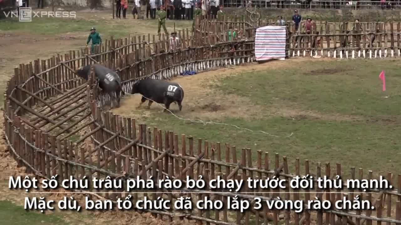 Trong hội chọi trâu truyền thống ở xã Hải Lựu, Vĩnh Phúc, chú trâu thi đấu thua đã lồng lên bỏ chạy, phá thủng một hàng rào chắn an toàn.