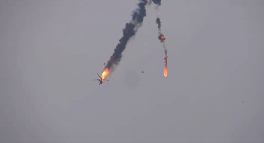 Video cho thấy chiếc trực thăng chìm trong biển lửa, nhưng vẫn tiếp tục bay thêm một đoạn trước khi bị mất kiểm soát và rơi xuống. Theo phóng viên Sputnik, cuộc tấn công do nhóm liên minh với mặt trận Al-Nusra thực hiện. Không có thông tin nào về thương vong.