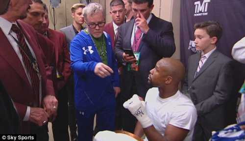 | HLV Freddie Roach của Pacquiao (áo xanh) "chào hỏi" Mayweather (Ảnh: Sky Sports) |