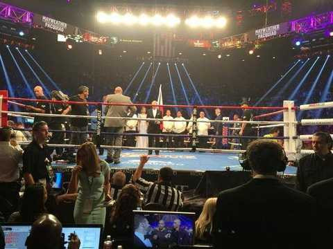 Tại MGM Grand lúc này diễn ra hiệp 1 cuộc so găng thứ 6 giữa Leo Santa Cruz - Jose Cayetano (10 hiệp, hạng lông). Cuộc so găng Mayweather - Pacquiao sẽ bắt đầu sau khi trận đấu này kết thúc.