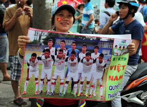 Khác với gương mặt khó chịu, gấp gáp của những tay phe vé, các bạn sinh viên tỏ ra rất niềm nở, vừa bán vừa cổ động, ủng hộ tinh thần đội tuyển U19 Việt Nam.