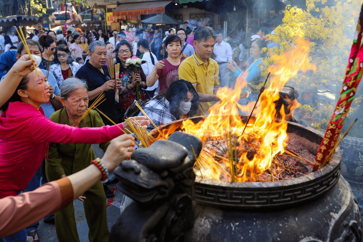 Người đi lễ mỗi lúc một đông, nhà chùa liên tục dùng loa nhắc "chỉ mang ba cây hương vào chánh điện, không cắm nhang vào bồn hoa, chậu kiểng...".