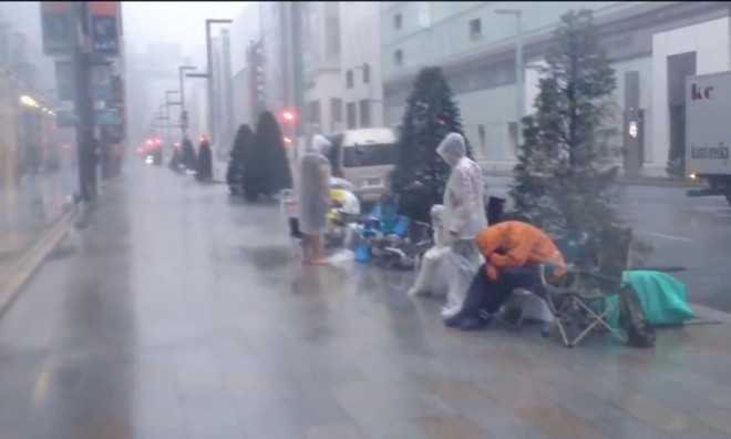 Những người xếp hàng chờ mua iPhone mới tại Tokyo (Nhật Bản) đã được mời vào bên trong cửa hàng bán lẻ của Apple đẻ tránh cơn bão lớn.