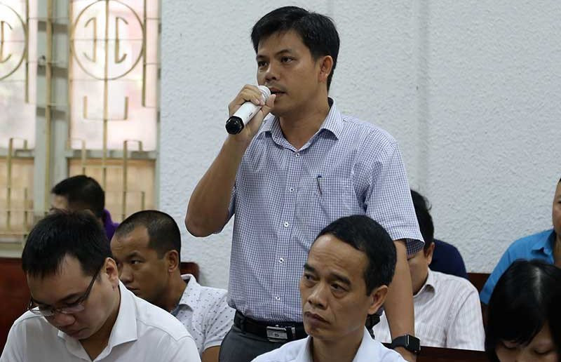 Ông Phạm Xuân Quang (đứng), kế toán trưởng Công ty Lọc hóa dầu Bình Sơn, trả lời tòa. (Ảnh: TP)