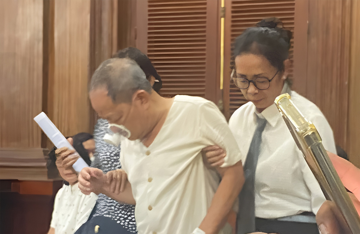Bị cáo Thái được người thân dìu đến toà và phải thở khí dung. (Ảnh: Hoàng Thọ)