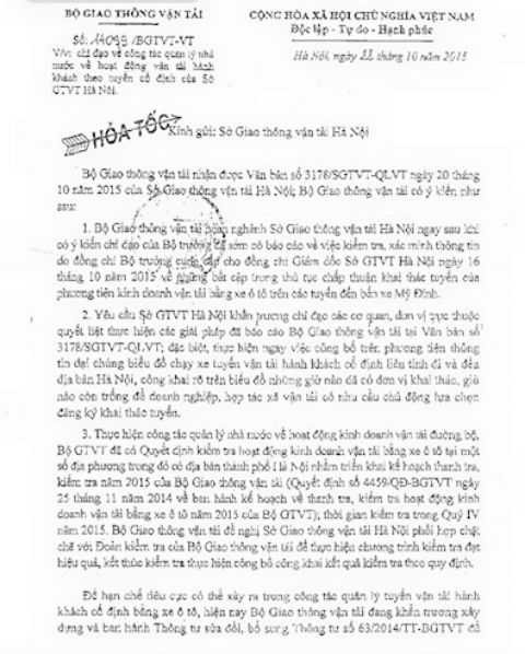 | Công văn hỏa tốc của Bộ GTVT gửi Sở GTVT Hà Nội. |