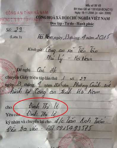 Vẫn thông tin từ ông Khải, mới đây, công an xã Tiên Tân đã bắt giữ Phạm Văn Thọ (anh chồng của Lệ) về hành vi buôn bán ma túy. Cách đây vài ngày, chính ông Khải đã chuyển giấy triệu tập đối tượng Đinh Thị Lệ của Công an tỉnh Hà Nam để phục vụ công tác điều tra, nhưng Lệ không có nhà.