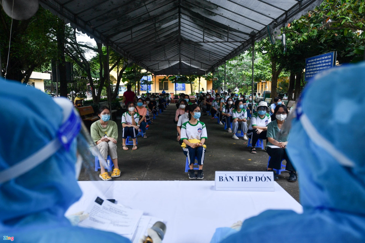 Các học sinh lớp 12 xếp hàng chờ tiêm vaccine ở huyện Củ Chi. (Ảnh: Duy Hiệu)