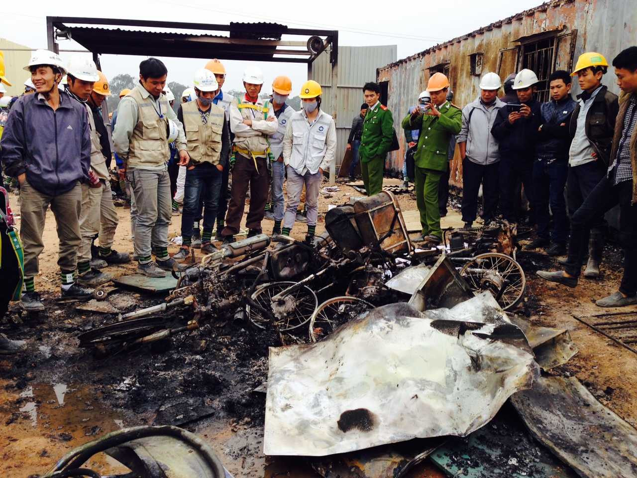 Không dừng lại ở đó, các công nhân còn xông vào đốt trụi 3 container là nhà làm việc của lực lượng bảo vệ và lực lượng cảnh sát tại chỗ. Hơn 20 xe máy của bảo vệ khu tổ hợp cũng bị đốt trụi.