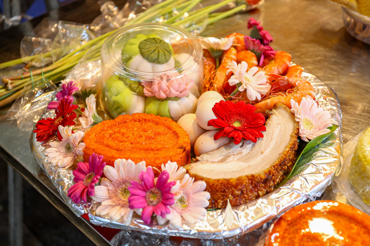 Mâm cỗ cúng rằm tháng 7 gồm xôi gấc, hoa tươi, bánh bao chay, trứng luộc, tôm luộc, thịt heo quay trang trí đẹp mắt như trong ảnh được bán với giá 800.000 đồng.