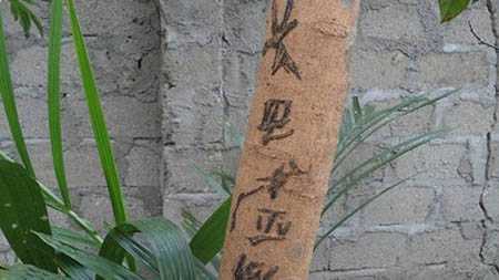 Theo quan sát của phóng viên, hàng chữ trên thân cây nhãn này kéo dọc theo thân cây, với 6 ký tự khác nhau giống như chữ Hán, nằm cách mặt đất hơn 1 mét. Các chữ này có màu đen, mặt chữ được đùn cao hơn so với vỏ thân cây nhãn, dùng tay không thể xóa được.