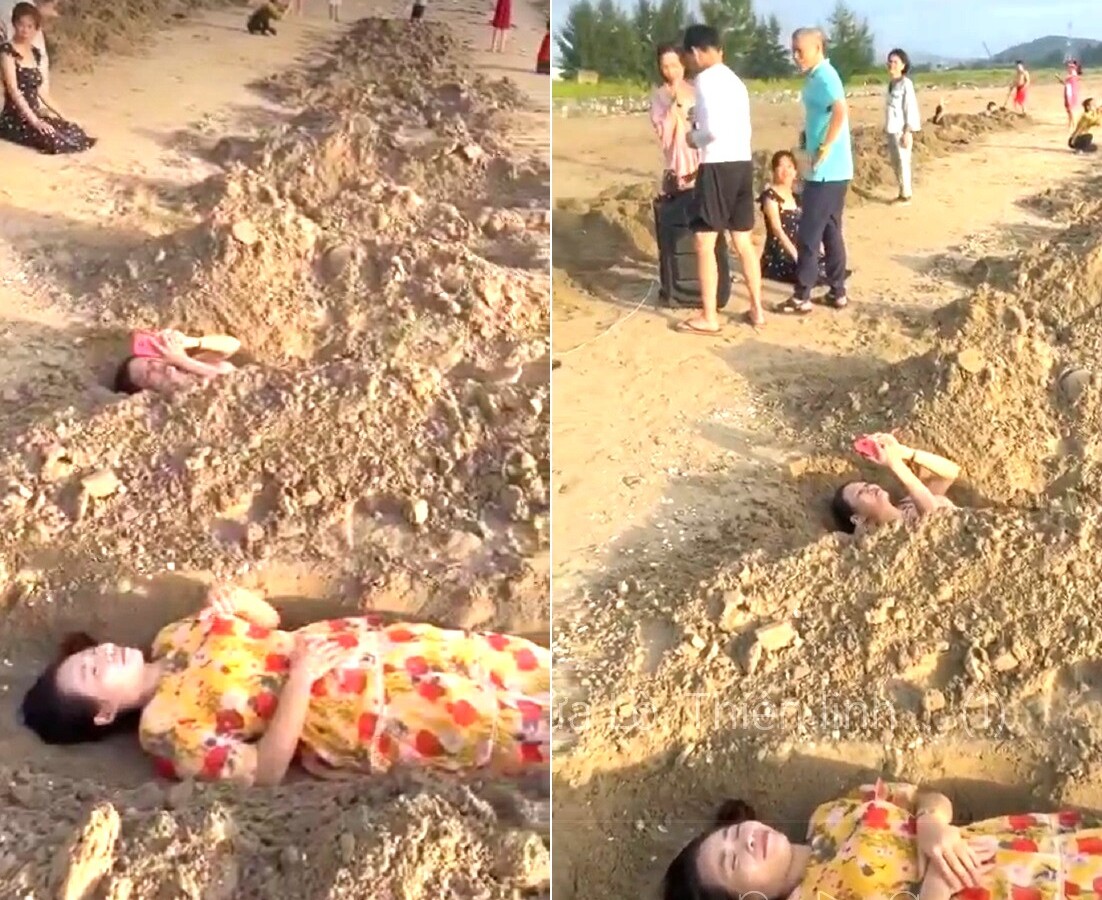 Trên mạng xã hội đang lan truyền đoạn clip ghi lại cảnh hơn 20 phụ nữ nằm dưới 20 huyệt mộ trên bãi biển Cửa Lò (Nghệ An) gây xôn xao dư luận. Những người xuất hiện trong đoạn clip mặc quần áo bình thường, có người mặc quần áo dài, váy không giống trong tình trạng đang tắm cát.