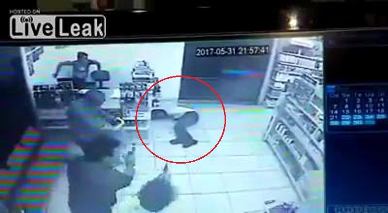 Tên cướp tự tin xông vào cửa hàng uy hiếp nhưng lại hậu đậu đánh rơi súng, còn chưa kịp nhặt lên đã bị các khách hàng trong cửa hàng rút súng ra bắn gục; vụ việc xảy ra tại Brazil.