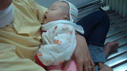 Nhập viện từ hôm 29 Tết, bé Đinh Văn Phú (19 tháng, Chương Mỹ, Hà Nội) vẫn còn rất đau và sợ tiếp xúc với người lạ, khóc thút thít. Mẹ bé buồn bã tâm sự: “Chị cháu đang đun nước ở bếp củi, cháu lấy que quàng vào quai xoong khiến nước đổ xuống bỏng toàn bộ hai chân và cánh tay. Cháu mới phẫu thuật hôm 1/ 2 cắt da từ đùi đắp lên hai tay do bỏng quá sâu, phải chờ cho vết thương khô hết nên tôi chưa biết khi nào được về”Bé Nguyễn Đạo An vẫn còn sốt li bì. Bé bị bỏng khi mới 3 tháng tuổi