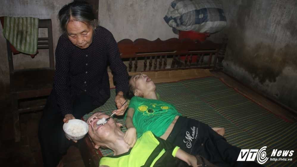 Trong căn nhà tồi tàn, chật hẹp, bà Nghĩa ngồi đút cơm cho chị Thúy và anh Vân, không thể ngăn nổi những giọt nước mắt, bà nghẹn ngào kể: “Nhìn vậy chứ cũng đã hơn 40 năm rồi, không đi đâu được cả. Hai đứa nó liệt giường mà giống như mình cũng liệt, vì suốt ngày phải chăm cho hai đứa, không thể rời mắt được. Đêm hôm đang thiu thiu ngủ, kể cả 2 giờ sáng, hai đứa mà ú ớ gọi là phải lò mò dậy đỡ cho nó đi vệ sinh ngay trên giường”.