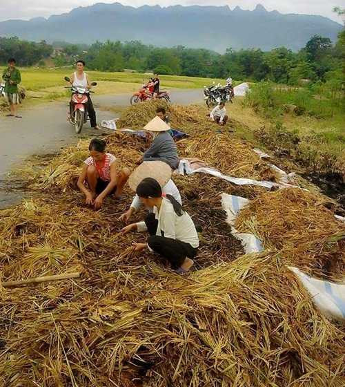 Theo đó, sau khi cắt lúa, thấy thời tiết xấu, nhiều nông dân tại xã Lai Đồng đã xếp lúa ven đường rồi dùng bạt đậy lại để ngày hôm sau tuốt.