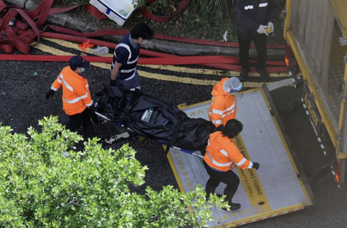Sáng sớm 28/11, lực lượng chức năng đã huy động xe vận chuyển cỡ lớn đến hiện trường vụ hoả hoạn tại khu chung cư Wang Fuk Court để di chuyển một số thi thể nạn nhân được bọc trong túi ni lông đen ra khỏi hiện trường.