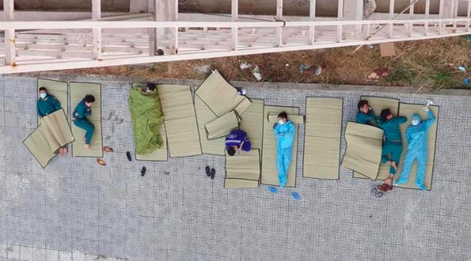 Bức ảnh về những con người sẵn sàng cống hiến trong mọi hoàn cảnh, điều kiện vật chất khó khăn chạm đến trái tim của bất cứ ai. Những người hùng thầm lặng ấy ngủ ngoài trời và dùng những tấm chiếu làm chăn giữ ấm. Có những tình nguyện viên vẫn còn mặc nguyên bộ đồ bảo hộ, luôn trong tư thế sẵn sàng khi có bệnh nhân đến khu cách ly.