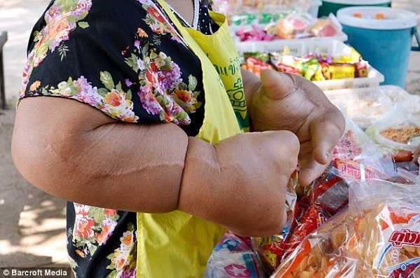 Mắc chứng bệnh kỳ lạ có tên macrodystrophia lipomastosa khiến đôi tay phát triển quá khổ, bác uangjay Samaksamam, 50 tuổi đến từ Thái Lan trở thành người phụ nữ mang đôi tay to nhất thế giới.