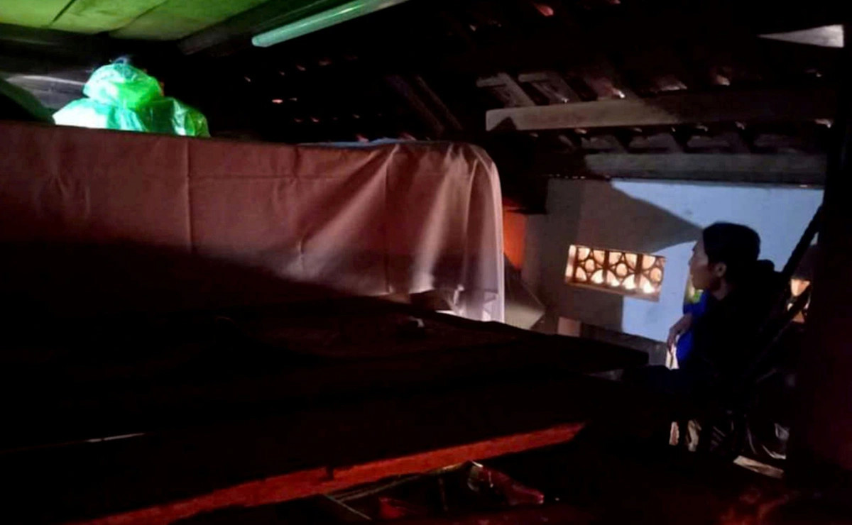 Cả những người thân cũng ngồi co ro trên không gian chật hẹp đó, không còn chỗ nào để thoát. Tối 27/10, nước lũ lên rất cao, nhà bà Hẹ lại thấp, nước ngập vào nhà 1,6 mét nên gia đình tính phương án thuê giàn giáo để bỏ quan tài lên cao.